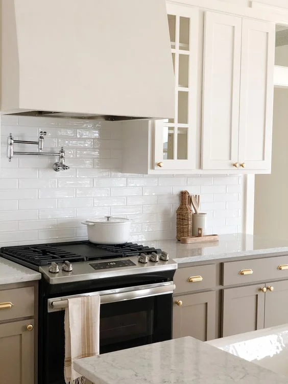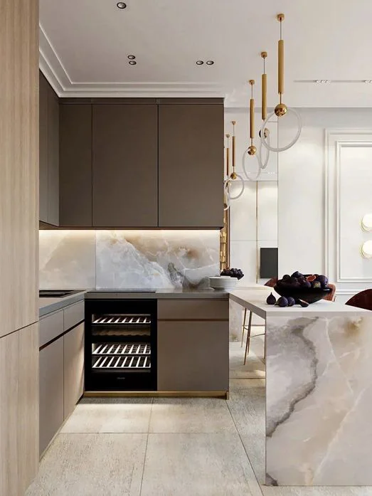 Этот цвет восхитительно практичен в кухонном пространстве. Он не такой маркий , но создает ощущение чистоты и порядка. Серо-коричневый цвет фасадов может сливаться со стенами кухни или лишь на чуть-чуть отличаться по тону, создавая единое пространство. Фасады без ручек сделают кухню ещё более монохромной. Если добавить яркие пятна и цветовые акцентные решения в композиции с серо-коричневым, то кухня обретает совсем иной вид. Это могут быть орнаменты и текстуры как в деталях, так и в более локальных зонах, такие как стены или мебель.