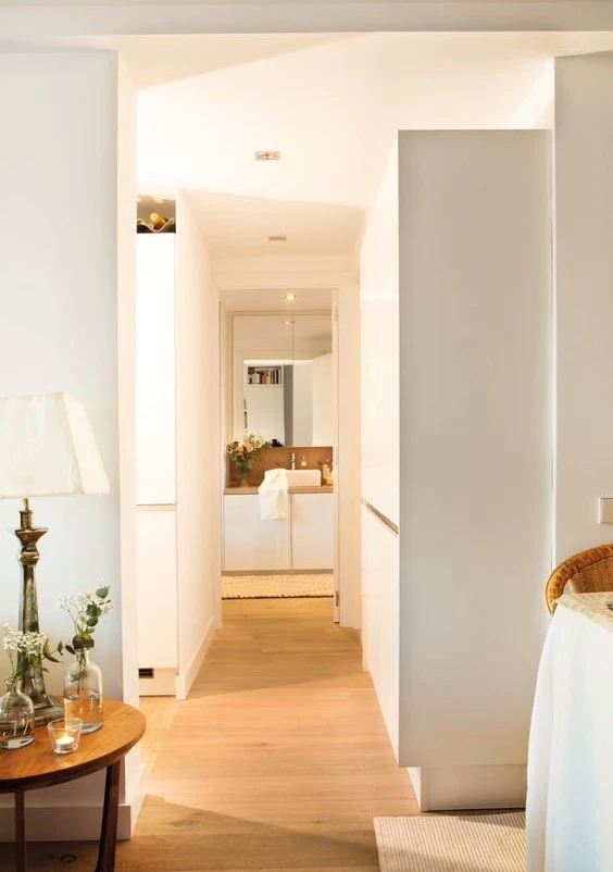 Длинные и большие коридоры часто либо не целесообразно используются, либо совсем пустуют, бездарно пропадая в помещении. Длинные и узкие коридоры и вовсе съедают пространство квартиры, а использовать их не всегда удобно. Планировка с небольшим холлом, в котором есть проходы и доступы во все комнаты, будет более удачной.