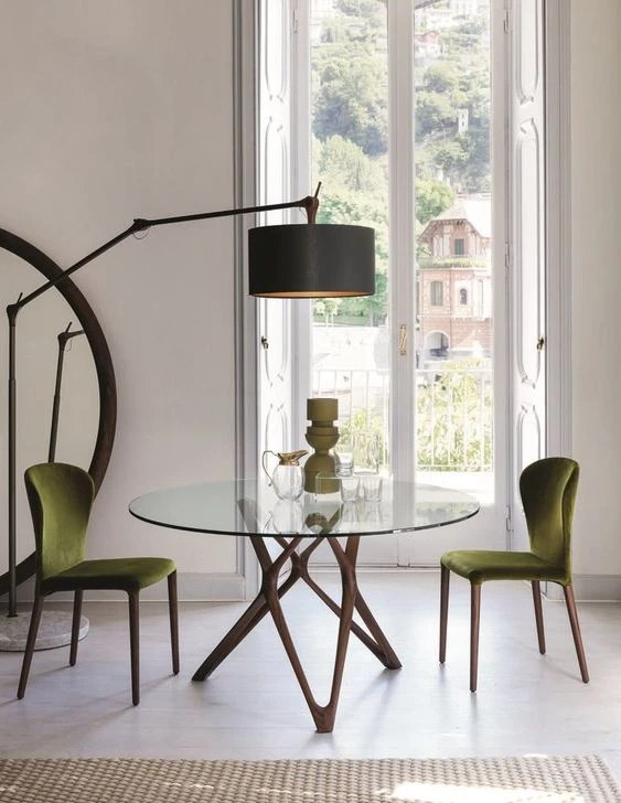 Деревянные стулья обтекаемой формы выглядят стильно и непринуждённо. Стеклянный круглый стол – прекрасный компаньон. Дерево в интерьере всегда создаёт тёплые и приятные впечатления, передавая мягкую атмосферу. А в сочетании со стеклом лишь даёт ещё больше любоваться его текстурой.